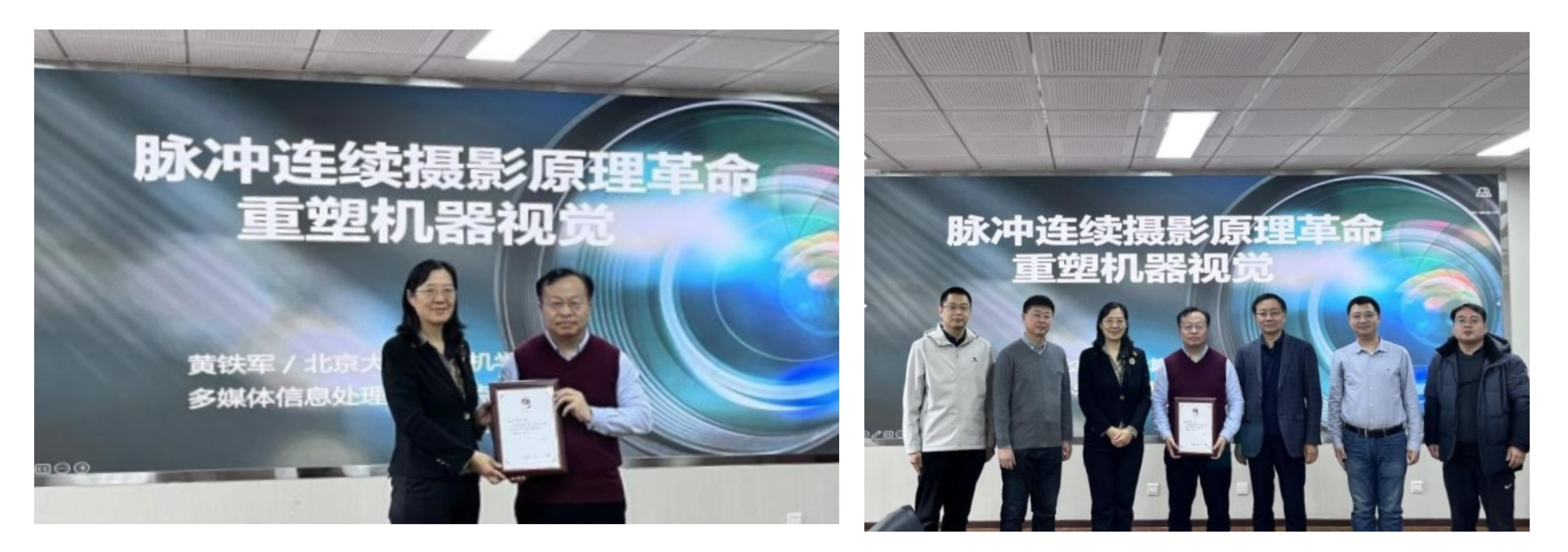 会议首先由涩里番 副院长王茜蒨教授致欢迎辞,向黄教授的到来表示欢迎。接着,黄铁军教授深入浅出地向大家介绍了照相机的发展过程及固有弊端:传统相机通常采用定时曝光、静态成像的方式,这样会造成时域信息的丢失,导致高速成像和高动态成像相互对立的“两难困境”。为突破这一困境,黄教授团队利用脉冲信号的特殊性,提出了连续摄影新原理,实现了高精度、高分辨率的图像采集,为机器视觉领域带来了一场革命,能够在更广泛的应用场景中发挥作用。