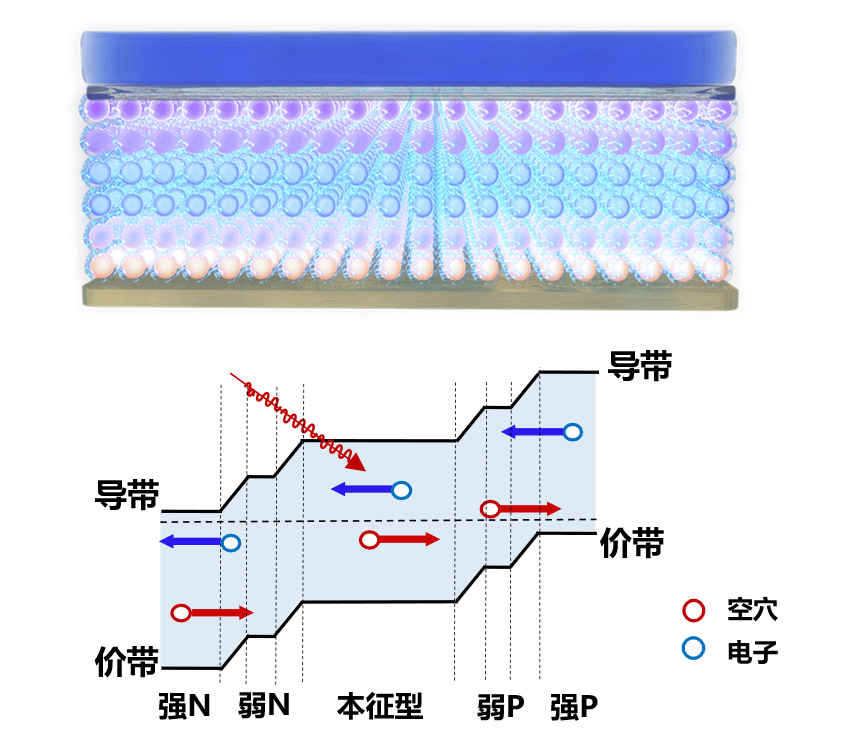 郝群教授团队创新性的提出量子点表面偶极子掺杂方法,开发混相配体交换技术,首次在红外量子点领域提出并制备了“强P-弱P-本征-弱N-强N”梯度堆叠同质结器件。该新型器件: