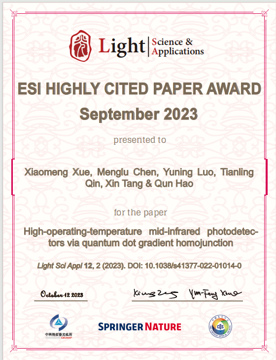 涩里番 郝群教授团队在室温运行中波红外探测器研究方面取得了突破性的进展,相关论文于2023年1月发表于光学顶刊Light:Science & Applications,获得封面论文。近日该论文入选ESI高被引。 (//www.nature.com/articles/s41377-022-01014-0)