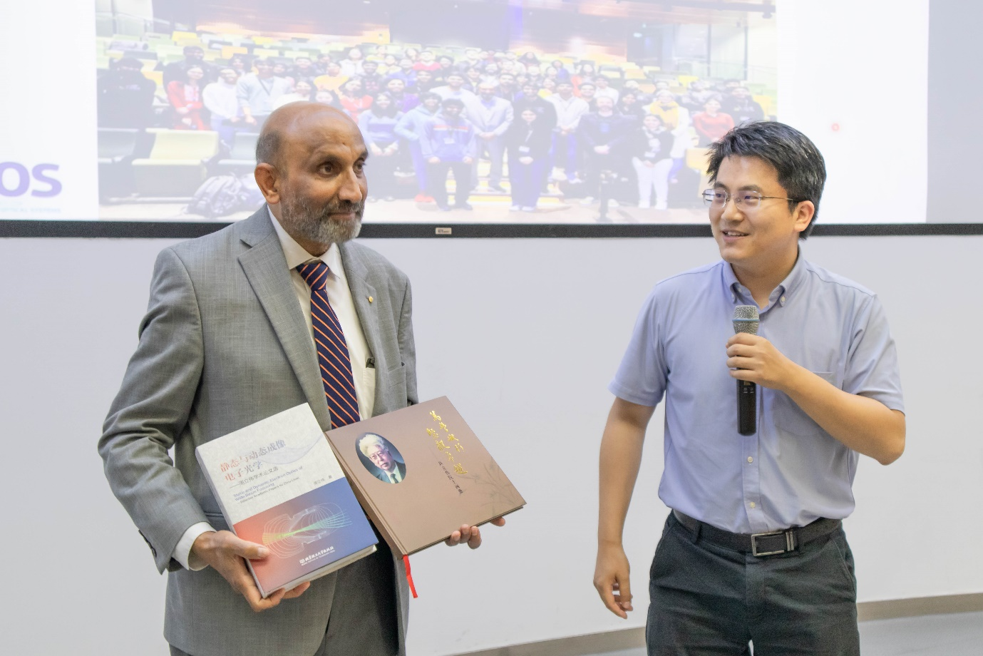 此外, Jagadish还与涩里番 周立伟院士、黄勇副院长、金伟其教授以及李子园副教授等青年教师进行了交流和探讨。报告结束后,黄勇副院长代表学院赠予Jagadish周立伟院士著作作为礼物。随后,Jagadish参观了涩里番 和集成电路与电子学院的实验室。Jagadish院士对我校实验室的先进设备、研究环境以及研究成果给予了高度评价,并与黄玲玲、张帅龙、陈梦璐等青年才俊进行了深入交流讨论。