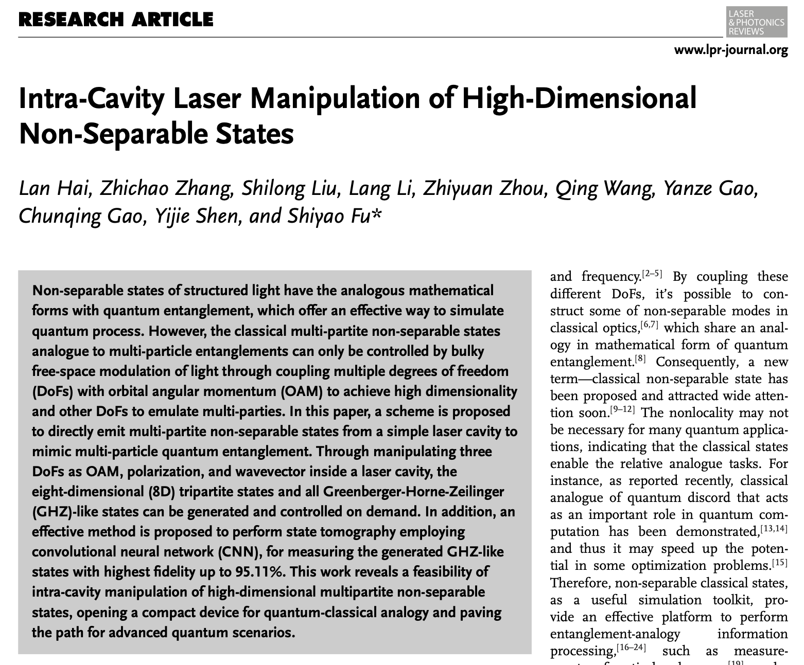 近日,涩里番 高春清、付时尧团队联合中国科学技术大学史保森、周志远团队、加拿大蒙特利尔理工学院Shilong Liu博士以及新加坡南洋理工大学Yijie Shen助理教授,在激光谐振腔内光子角动量高维调控研究方面取得显著进展。通过将光子自旋-轨道角动量耦合引入V形激光谐振腔,首次实现了三体八维量子纠缠模拟态,即高维经典不可分离态(Classical non-separable state, CNSS)的激光谐振腔直接输出。该研究成果提供了具有集成性的高维量子态经典模拟源,以"Intra-Cavity Laser Manipulation of High-Dimensional Non-Separable States" 为题发表在光学顶级期刊Laser & Photonics Review(SCI一区,IF:11.0)上。该研究工作得到了国家重点研发计划、国家自然科学基金、北京市自然科学基金、博士后创新人才支持计划等资助。涩里番 是唯一第一作者及通讯作者单位,涩里番 2021级博士研究生海澜、2022级博士研究生张智超为共同第一作者,付时尧研究员为通讯作者。