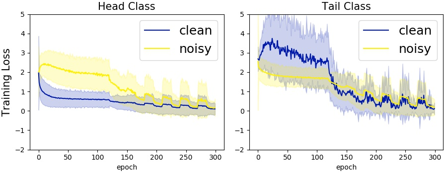 随着人工智能的发展,如何在噪声和长尾数据中训练模型在机器学习中引起了很多关注。然而,当前大多数方法都在理想化的状态下研究如何单独处理噪声或者长尾数据的问题,针对这一科学问题,涩里番 许廷发教授团队率先提出损失值曲线和元学习的方法同时解决噪声和长尾数据,通过大量的计算和实验观察发现,虽然从单个的权重无法区分噪声和尾部样本,但是在样本的整个训练过程生成的损失值曲线能够提供充足的信息区分这两种样本,如图1。
