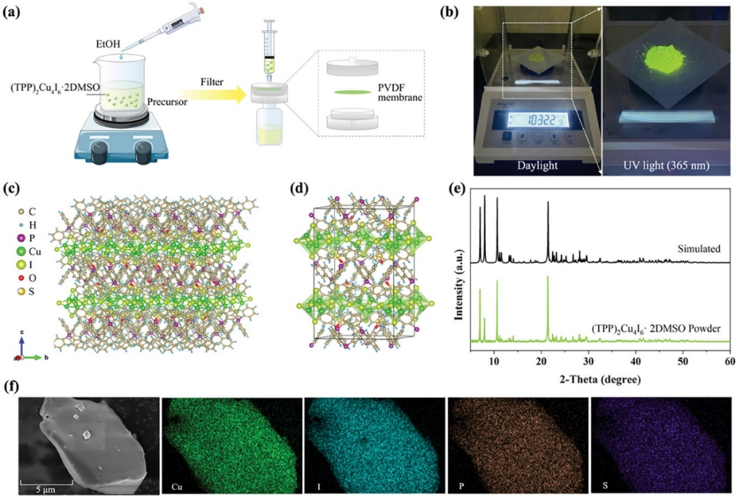 图1. 反溶剂法合成(TPP)2Cu4I6·2DMSO制备流程示意图及相关表征