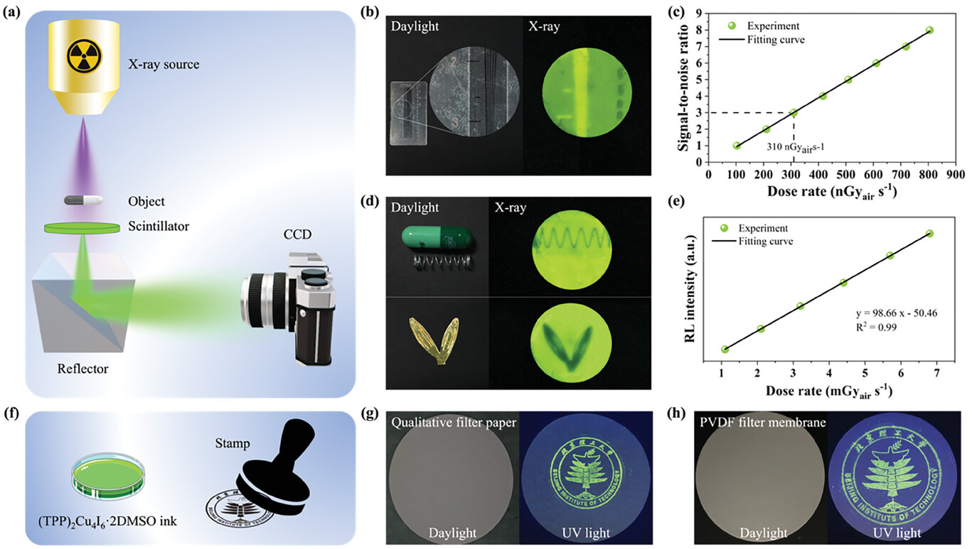 该团队探索了(TPP)2Cu4I6·2DMSO的不同发光应用:下转换白光LED、闪烁体、荧光墨水,实现了高效的冷白光和高质量全光谱白光、对物体的X射线成像及可见光下隐形的加密图案。
