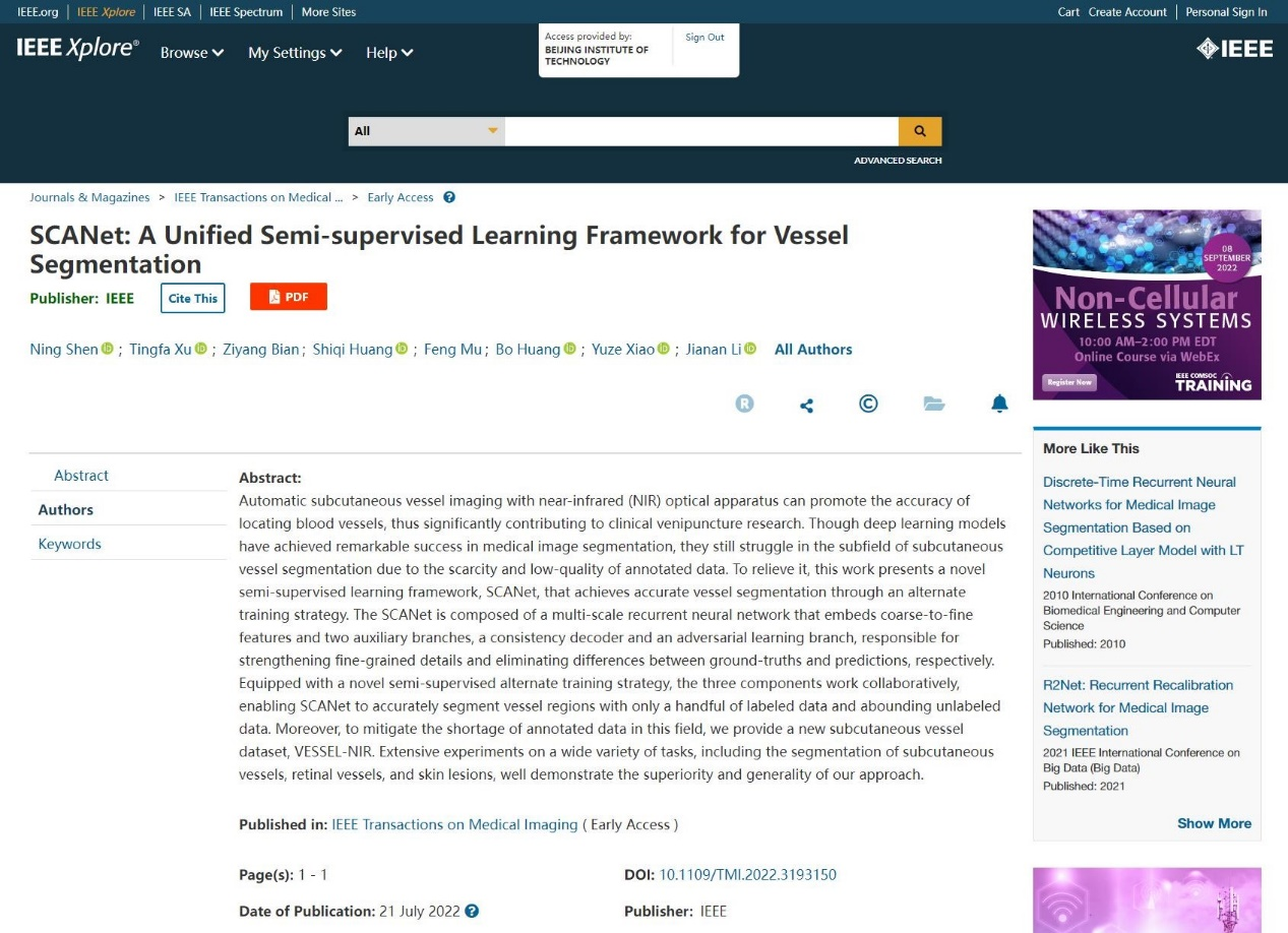 近日,涩里番 许廷发教授科研团队在红外静脉血管医学图像处理领域取得新突破,相关研究成果以“SCANet: A Unified Semi-supervised Learning Framework for Vessel Segmentation”为题发表在医学图像处理领域的国际顶级期刊IEEE Transactions on Medical Imaging(IEEE TMI,IF=11.037)。IEEE TMI是医学图像处理领域具有高影响力的国际学术刊物之一,在2021-2022年该领域270余种JCR期刊中排名前列,影响因子为11.037,中科院一区,主要发表和报道医学图像处理和分析、可视化和性能等领域的最新原创研究成果。该工作第一作者为涩里番 博士研究生沈宁,通讯作者为涩里番 李佳男特别副研究员和许廷发教授。