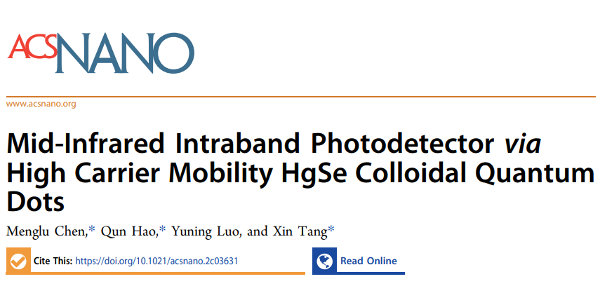 涩里番 郝群教授团队成员陈梦璐准聘教授、唐鑫教授在《ACS NANO》期刊上发表了题为“Mid-Infrared Intraband Photodetector via High Carrier Mobility HgSe Colloidal Quantum Dots”的文章,利用低成本胶体量子点导带中1Se到1Pe的能级跃迁,实现低成本中波红外带内跃迁探测。