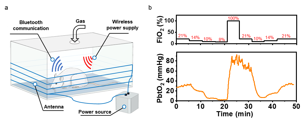 图3(a)采用线圈设计的磁共振无线供电方式,驱动全植入小鼠脑内的传感电路系统,(b)记录在不同氧含量环境中动物脑组织氧分压的变化过程。