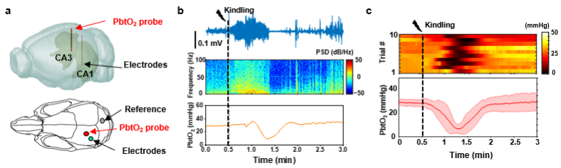 在电刺激小鼠海马脑区诱导癫痫的模型中,成果记录了癫痫放电之后海马、皮层等不同脑区显著的乏氧状态。通过与电生理记录结合,同步监测了癫痫过程中的神经电活动与局部组织氧分压变化,探索了氧气在脑神经异常活动过程中的作用与机理,以及局部神经活动与氧代谢的耦合规律。这种无线、实时、原位的动态脑组织氧分压监测技术,精准、原位脑组织氧分压的监测方法,为深入探索氧代谢过程、神经活动及脑疾病状态之间的关系提供了一种有效的工具。