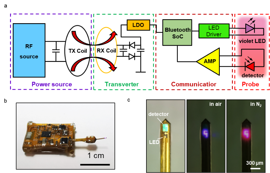 图2无线植入式组织氧传感的系统设计:(a)电路框架图;(b)实物图;(c)不同氧含量状态下探针磷光强度的对比。