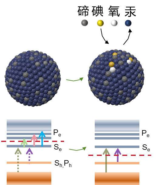 本工作通过薄膜场效应管及双电位电化学实验探明了极限尺寸红外量子点光电探测性能的主要限制是光生载流子漂移长度与传输通道长度相比较短。针对该难点,研究组在前期配体交换(Nature Materials 2020, 19, 323–329. //doi.org/10.1038/s41563-019-0582-2)及表面偶极子掺杂调控(Light: Science & Applications 2023, 12 , 2,//doi.org/10.1038/s41377-022-01014-0)工作的基础之上,提出了碘离子配体修饰方法(如图3所示),钝化量子点的富金属表面,实现掺杂精准调控。
