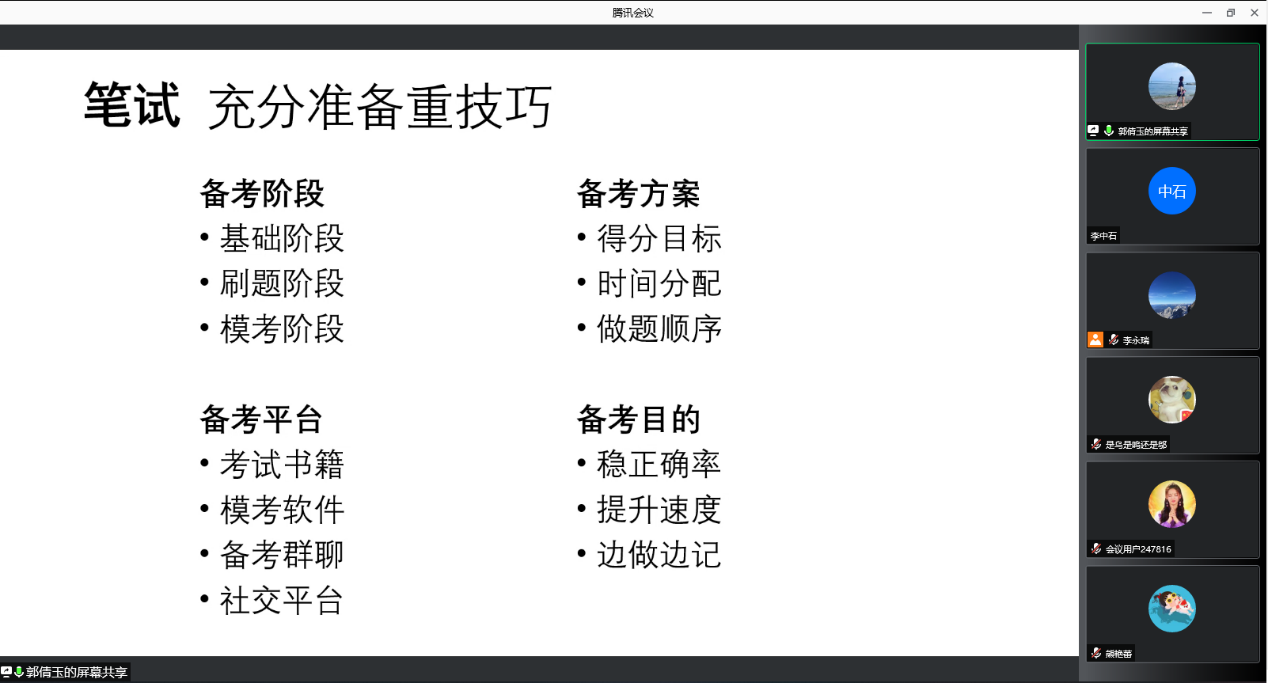 首先,郭倩玉以自身的求职经历为切入点,从国考的基本概念、流程安排、岗位选择、笔试面试的备考技巧等方面为大家系统地介绍了国考备考的相关知识,同时分享了自身的成功经验。