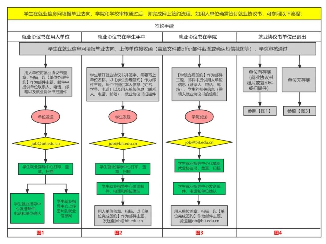 学生在就业信息网填报毕业去向,学院和学校审核通过后,即完成网上签约流程。学校按网上签约信息办理派遣手续,无需签订纸质就业协议。如用人单位确需签订就业协议书,可参照以下流程: