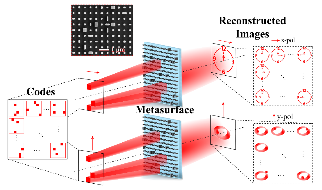 现有的超表面全息复用技术主要围绕光学参量展开,实现更大容量、更多通道的光信息记录与重建是研究人员们重点攻关的方向之一。为了解决如何进一步增加调控维度、提升信息密度的问题,研究团队借鉴了信息通信领域成熟的码分复用技术实现了多通道独立图像重建。基于全息信息高度冗余的特性设计编码参考光,利用团队提出的优化算法,结合超表面的偏振复用特性,将32个通道的图像信息全部记录在单片超表面全息上。通过特定的照明与偏振条件才能准确获得记录的信息。根据编码信息时序照明,可以实现动态光学投影。该方法能够提高超表面全息的信息密度,可应用于动态全息显示、光学信息存储以及光信息加密等领域。
