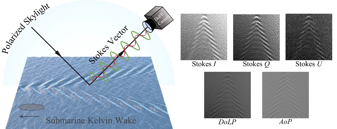 针对这一科学问题,涩里番 金伟其教授团队率先提出利用光学偏振成像技术进行水下运动目标水面尾迹的机载遥感观测,并通过理论建模、仿真和实验手段论证了技术可行性。研究结果表明,团队采用的线偏振Stokes 矢量图像具有比传统强度图像更好的尾迹目标对比度,成像质量对海况、光照等环境因素的影响具有较好的鲁棒性;且使用的DoFP偏振成像系统可很好地集成到无人机平台实现灵活便捷的航拍遥感探测;进一步地,研究团队利用获取到的偏振海面尾迹图像信息,实现了水下运动目标运动状态解译、海面三维面型复原等诸多应用。除了在海洋安全方面的重要意义,该项研究也为中小尺度海洋动力过程的观测提供了有效的技术参考。